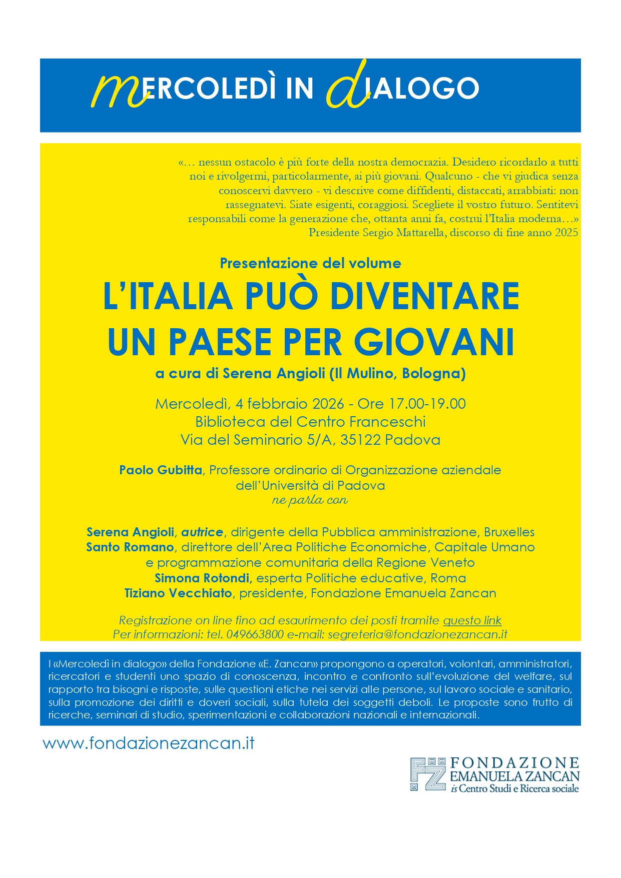 Paolo Gubitta, Professore ordinario di Organizzazione aziendale dell’Università di Padova, ne parlerà con Serena Angioli, autrice del volume e dirigente della Pubblica amministrazione, Bruxelles, Santo Romano, direttore dell’Area Politiche Economiche, Capitale Umano  e programmazione comunitaria della Regione Veneto, Simona Rotondi, esperta Politiche educative, Roma, Tiziano Vecchiato, presidente, Fondazione Emanuela Zancan.