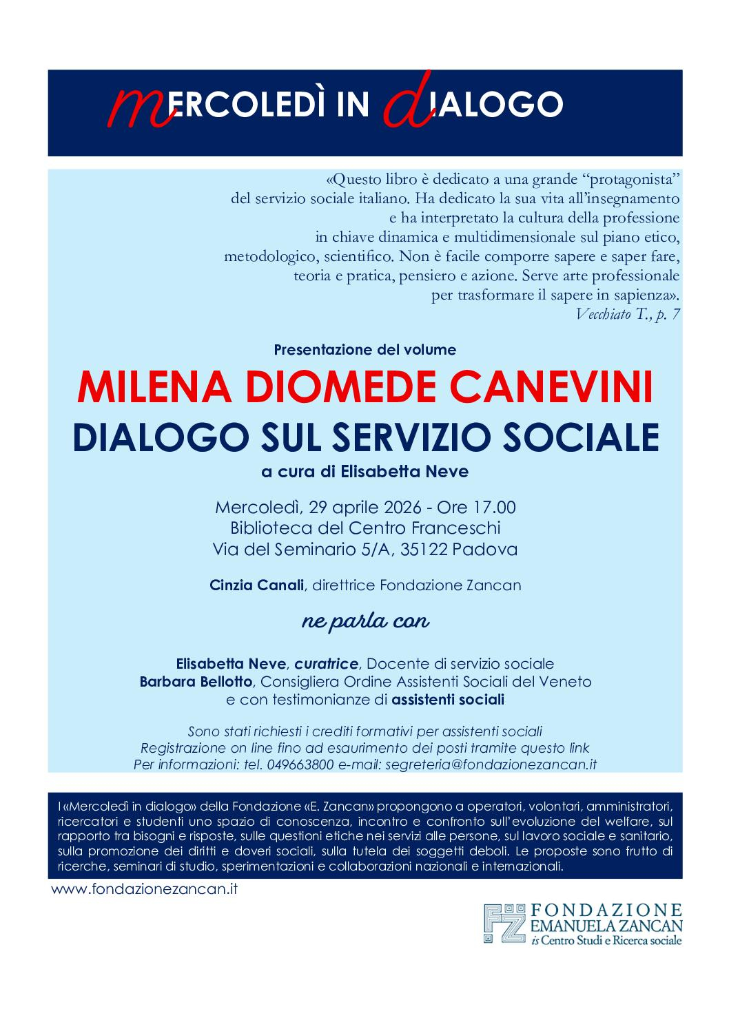 Il 29 aprile vi aspettiamo per il prossimo mercoledì in dialogo durante il quale verrà presentato il volume “Milena Diomede Canevini. Dialogo sul servizio sociale”, curato da Elisabetta Neve
